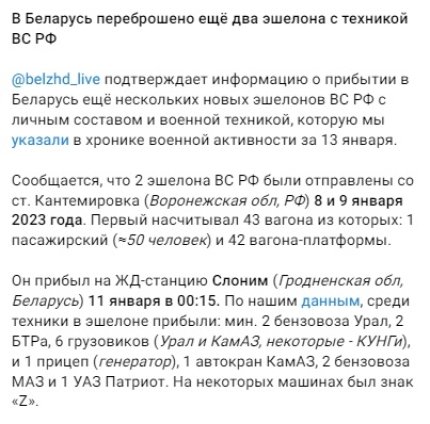 Окрім того, наголошується, що наступного дня, 12 січня о 08:00, на станцію Слонім із Кантемирівки прибув ще один ешелон ЗС РФ, що налічував уже 52 вагони: 3 пасажирських (≈150 осіб) і 49 вагонів-платформ.