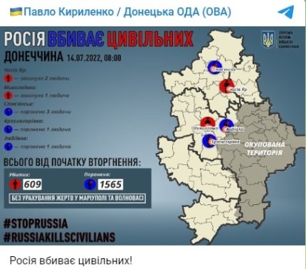 За 12 липня росіяни вбили 4 мирних жителів Донеччини: 2 в Авдіївці, 1 у Бахмуті і 1 у Часовому Ярі. Ще 8 людей отримали поранення. Наразі неможливо встановити точну кількість жертв у Маріуполі та Волновасі. Росіяни будуть відповідати за кожен свій злочин на українській землі, - розповів нещодавно Петро Кириленко.
