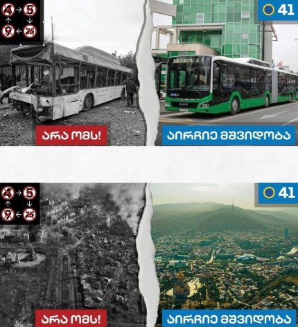 Натомість з правого боку зображені об'єкти, збудовані та відновлені мільярдером Бідзіною Іванішвілі, а також нічний Батумі з написом «Вибери мир».