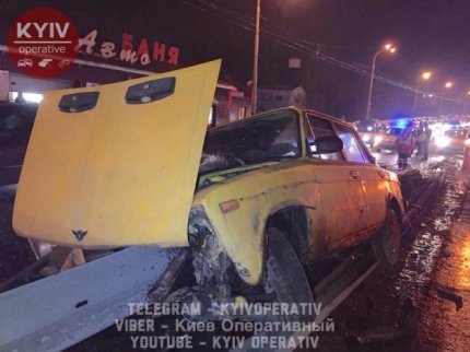 Повідомляється, що аварія сталася на з'їзді з шляхопроводу по вулиці Луговій на Оболоні. Водій ВАЗ-21-6 не впорався з керуванням і налетів на відбійник. В результаті, автомобіль буквально насадило на метал розірваний.