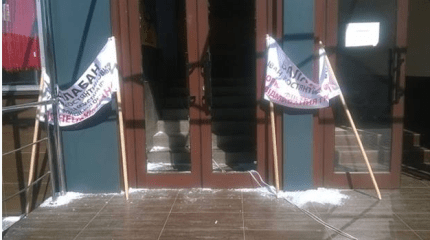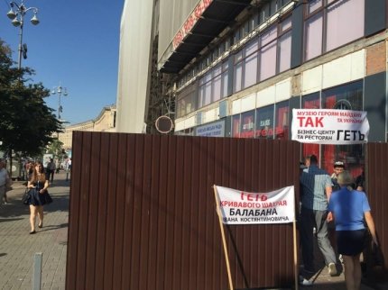 Перед проходом в паркані висить транспарант з написом: "Музею героям Майдану і України - Так. Бізнес-центр і ресторан - геть".