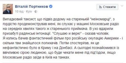 "Я колись бачив фантастичний фільм про російську окупацію Америки - і скільки там знайшлося прихильників. Потім спостерігав, як це нефантастично було в Криму і на Донбасі. А сьогодні познайомився з ввічливою сірою людиною, яка буде чекати мене біля під'їзду, якщо Московське радіо заїде до Києва на танках", - додав Портніков.