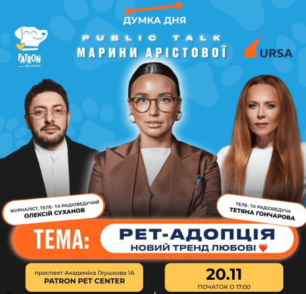 - Благодійний Public Talk Марини Арістової розкриє важливість адопції тварин в Україні та нагадає про захист їх прав.