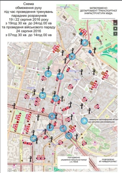 У Києві через репетиції військового параду до Дня Незалежності України 22 серпня з 16:30 перекриють ряд вулиць і обмежать рух автотранспорту.
