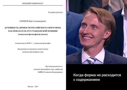Так, відомий блогер Рустем Адагамов опублікував фотокопію титульної сторінки дисертації Скобрєва на здобуття вченого ступеню кандидата філософських наук на тему «Духовність особистості російського спортсмена як показник його громадянської позиції», написаної 2014 року.