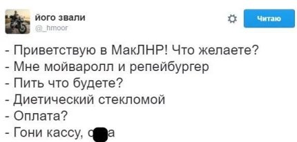 У соціальних мережах уявили, якою була б робота ресторанів швидкого харчування Макдональдс, якби вони відкрилися на території, окупованій бойовиками ЛНР.
