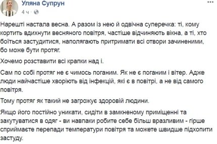 "Не обов'язково сидіти біля відкритого вікна - можна пересісти туди, де не дме. А за можливості - краще вийдіть на деякий час на вулицю, поки приміщення провітрюється. Якщо ж ви любите свіже повітря в кімнаті - провітрюйте на здоров'я і нічого не бійтеся. Однак і не зловживайте ",- підбила підсумок Супрун.