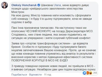 "Особисто я підтримую і буду підтримувати багато ініціатив, започаткованих Вашою командою. Однак, це не означає, що нова команда повинна утриматися від аналізу їх результатів і внесення коректив з метою підвищення ефективності системи", - написав Гончарук.