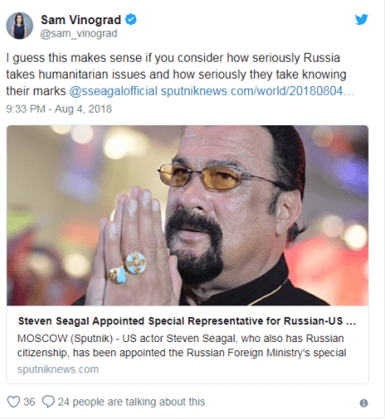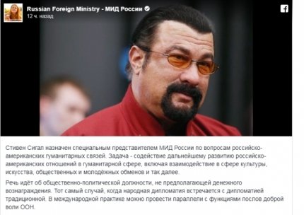 МЗС Росії призначило голлівудського актора Стівена Сігала спецпредставником Росії з гуманітарних зв'язків з США. Йому доручено розвивати російсько-американські відносини у гуманітарній сфері, включаючи взаємодію в сфері культури, мистецтва, суспільних і молодіжних обмінів.