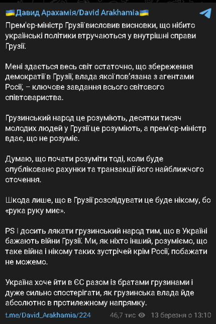 За словами голови фракції "Слуга народу" Давида Арахамії, "весь світ розуміє, що збереження демократії в Грузії, влада якої сповнена агентами Росії - це ключове завдання всього світового співтовариства".