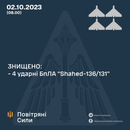 В ніч на 2 жовтня російські війська атакували Україну дронами-камікадзе Shahed. Силам ППО вдалося знищити 4 із 7 ударних безпілотників.