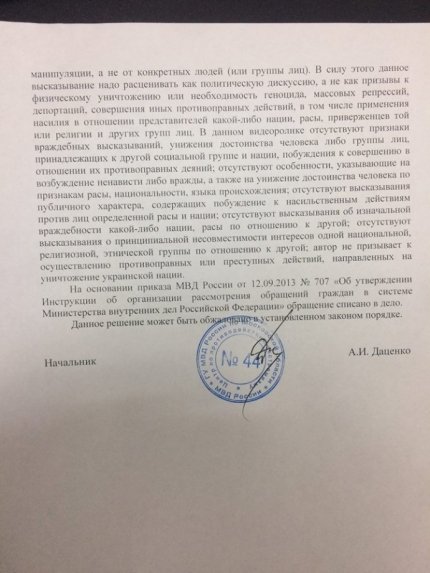 "Отримав відповідь від МВС РФ з приводу мого звернення розглянути на предмет екстремізму слова Гіркіна "українську націю потрібно знищити". Виявилося, що це "дискусія". Ознайомтеся з цим аналітично-експертним шедевром від МВС РФ", - написав він, додавши документи.