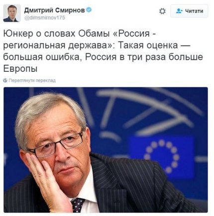 "Євросоюз займає площу в 5,5 мільйона квадратних кілометрів, а площа Росії - 17,5 мільйона, - сказав Юнкер. - Я хотів би, щоб з Росією ми говорили на рівних, тому що Росія не є, як про неї говорив президент Обама , "регіональною державою". Така оцінка - велика помилка".