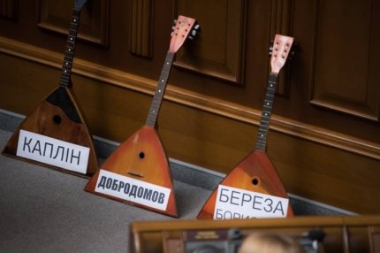 принесли три балалайки, підписані іменами нардепів від "Народного фронту" Борислава Берези, Сергія Капліна та Дмитра Добродомова.