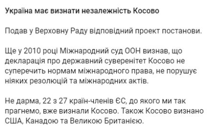Не дарма 22 з 27 країн-членів ЄС, до якого ми так прагнемо, вже визнали Косово. Також Косово визнано США, Канадою та Великою Британією. Тому послідовним кроком України зараз буде визнання державного суверенітету Косово і висловлення міжнародної підтримки, - пояснив свою позицію з цього приводу народний обранець.