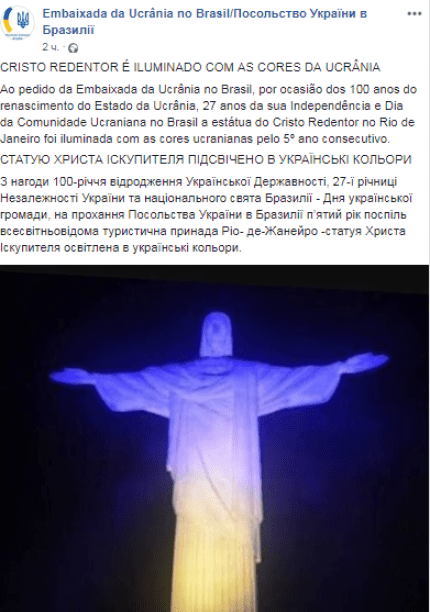 24 серпня, в День Незалежності України всесвітньо відома статуя Христа-Іскупителя в столиці Бразилії "засвітилася" кольорами українського прапора.