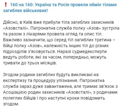 Не можна також не згадати про те, що 7 червня Україна та РФ провели обмін тілами загиблих військових за формулою "160 на 160".