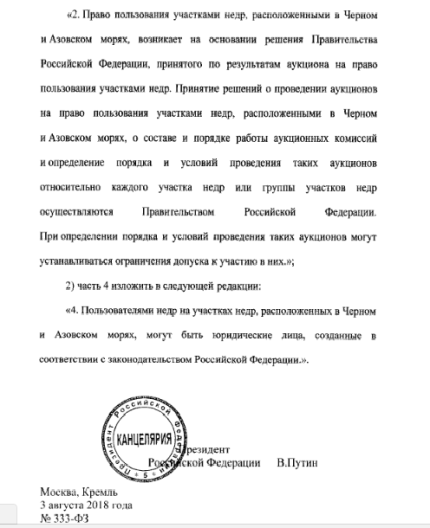 Новим законом російські окупанти визнали недійсними всі лінцензіі на надра Чорного і Азовського морів, які були видані органами України до анексії півострова. Відтепер, право на користування ділянками надр Криму окупанти будуть надавати тільки по рішенню російського уряду за результатами аукціонів.