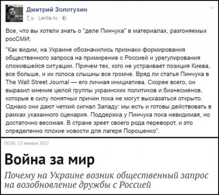 "Як бачимо, на Україні позначилися ознаки формування суспільного запиту на примирення з Росією і врегулювання ситуації, що склалася. Причому тих, кого не влаштовує позиція Києва, все більше, і їхні голоси можна почути все голосніше. Навряд чи стаття Пінчука в The Wall Street Journal - його особиста ініціатива. Швидше за все, він висловив думку цілої групи українських політиків і бізнесменів, які в силу зрозумілих причин поки не можуть висловитися відкрито. Однак вони дають чіткий сигнал Заходу: ми є і готові діяти в рамках зазначеного сценарію. Підтримка у Пінчука поки невидима, але досить вагома. У країні зріє свого роду переворот, і це безперечно погані новини для табору Порошенка", - цитує російські ЗМІ радник міністра інформаційної політики України Дмитро Золотухін.