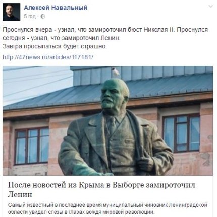 Російський опозиційний політик Олексій Навальний: "Прокинувся вчора - дізнався, що замироточив бюст Миколи II. Прокинувся сьогодні - дізнався, що замироточив Ленін. Завтра прокидатися буде страшно".