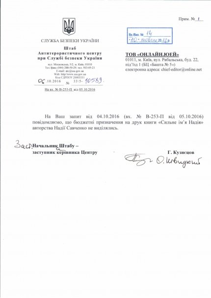 "На Ваш запит від 04.10.2016 (вх. № В-253-П від 05.10.2016) повідомляємо, що бюджетні призначення на друк книги "Сильне ім'я Надія" авторства Надії Савченко не виділялися", - йдеться в документі.