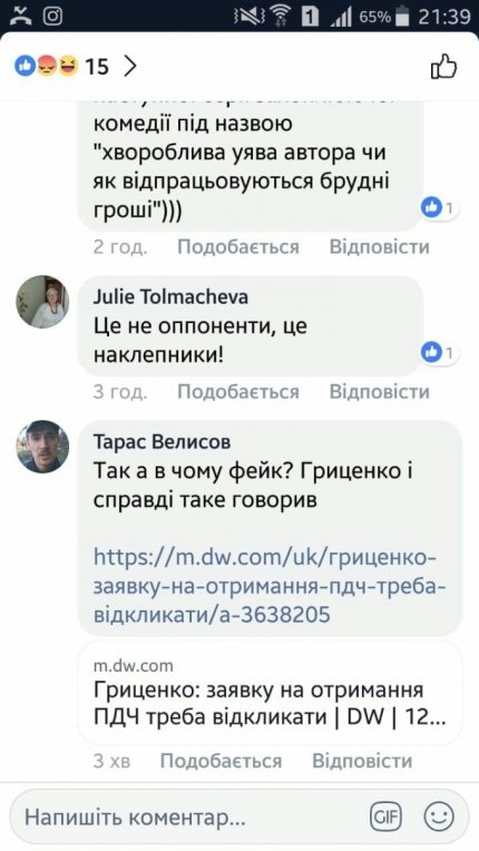 Але деякі користувачі Facebook не погодилися з тим, що тези про непотрібність НАТО для України з вуст Гриценко це фейк, і нагадали прихильникам екс-міністра оборони, що в інтерв'ю Deutsche Welle політик свого часу заявляв: «Україні слід у нинішній ситуації відкликати заявку на отримання Плану дій щодо членства в НАТО. «Я зараз би відкликав заявку на план дій щодо набуття Україною членства в НАТО і запропонував би змінити порядок денний зустрічі «Україна - НАТО», - стверджував тоді Гриценко.