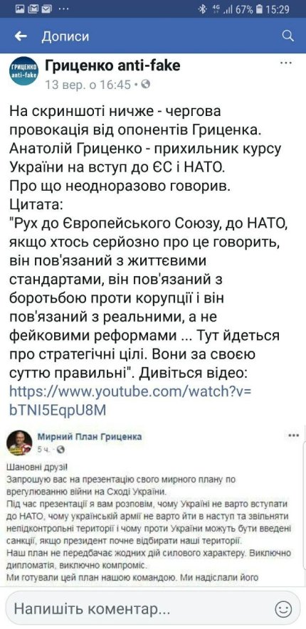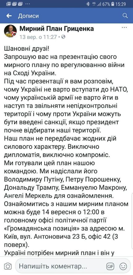 У соціальній мережі Facebook з'явилася сторінка «Мирний план Анатолія Гриценка», на якій від імені політика запрошують на презентацію мирного плану з врегулювання війни на Сході України. У тексті повідомлялося, що на презентації Гриценко розповість, чому Україні не варто вступати в НАТО, чому українській армії не варто йти в наступ і звільняти непідконтрольні території і чому проти України можуть бути введені санкції, якщо дослівно «президент почне відбирати наші території», пишуть Вєсті, повідомляє ONLINE.UA.