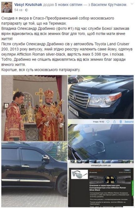 "Після служби Олександр Драбинко сів в автомобіль Toyota Land Cruiser 200 2013 року випуску, згідно з реєстром належить саме йому, одягнув окуляри Affliction Roman silver-black, вартість яких 5398 грн. І поїхав. Тобто Драбинко не поспішає відмовлятися від усіх земних благ заради вічного життя. Коротше, вся суть московського патріархату", - підкреслив журналіст.
