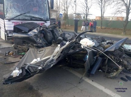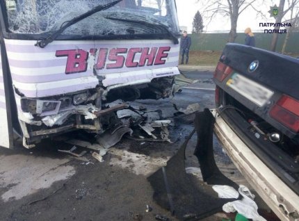 Свідок аварії розповів, що BMW виїхав на зустрічну смугу і його почало заносити. Автомобіль вдарився лівим боком об лобову частину автобуса.