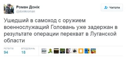 У той же час відомий український блогер та волонтер Роман Доник в своєму Twitter повідомив, що дезертир вже затриманий.