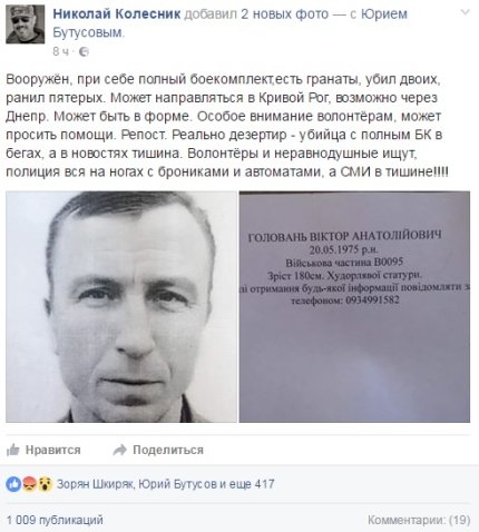 «Озброєний, при собі повний боєкомплект, є гранати, убив двох, поранив п'ятьох. Може направлятися до Кривого Рогу, можливо, через Дніпро. Може бути в формі. Особливу увагу волонтерам, може просити допомоги», - написав Колесник.