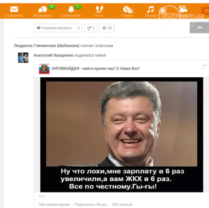 Учитель початкових класів з ЗШ№10 Людмила Глинянська просто постить в групу "Антимайдан" записи з карикатурами на президента України Петра Порошенка.