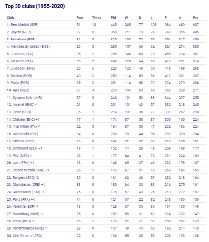 Футбольні клуби включали в рейтинг за кількістю очок, які нараховувалися команді за виступи в Кубку європейських чемпіонів і Лізі чемпіонів. За нічию командам нараховувався 1 бал, а за перемогу - 2 очки. Як зазначено в таблиці, київське "Динамо" провело 37 сезонів у єврокубках. "Біло-сині" зіграли 242 матчі, в яких отримали 101 перемогу і 88 поразок. Також київський клуб провів 53 гри з результатом "нічия".
