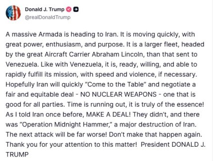 Величезна армада прямує до Ірану. Вона рухається швидко, з великою силою, ентузіазмом і цілеспрямованістю… Як і у випадку з Венесуелою, він готовий, бажає і здатний швидко виконати свою місію, зі швидкістю і насильством, якщо це буде необхідно.