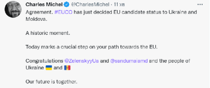 Угода. Європейська рада щойно вирішила надати статус кандидата в ЄС для України та Молдови. Історичний момент. Сьогодні вирішальний крок на вашому шляху до ЄС. Вітаємо Володимир Зеленський та Майя Санду і народ України і Молдови. Наше майбутнє разом.