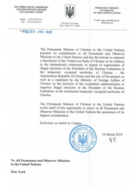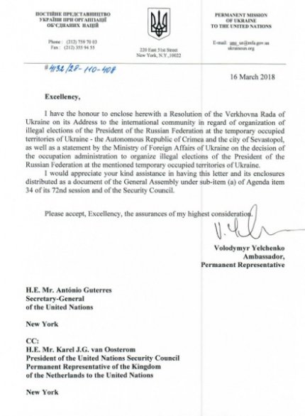 Офіційним зверненням в ООН Україна звернулася до всього міжнародного співтовариства у зв'язку з організацією незаконних виборів президента РФ на тимчасово окупованій частині території України - в АР Крим та місті Севастополі. Документ підписав постпред України при ООН Володимир Єльченко.