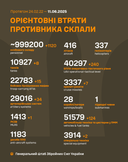 Загальні бойові втрати росіян з 24.02.22 по 11.06.25 орієнтовно склали: