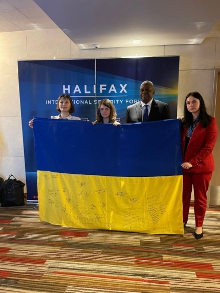 Активістки та воїни з України під час безпекового форуму у Галіфаксі (Канада) передали очільнику Пентагону Ллойду Остіну прапор, який ховала місцева мешканка на окупованій Херсонщині. Окрім того, вони попросили у глава Міноборони США літаки та сучасні танки для ЗСУ.