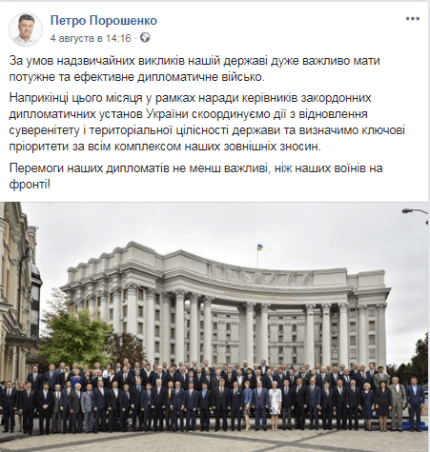 Раніше Петро Порошенко повідомляв, що в ході наради будуть скоординовані дії послів України щодо відновлення суверенітету і територіальної цілісності країни.