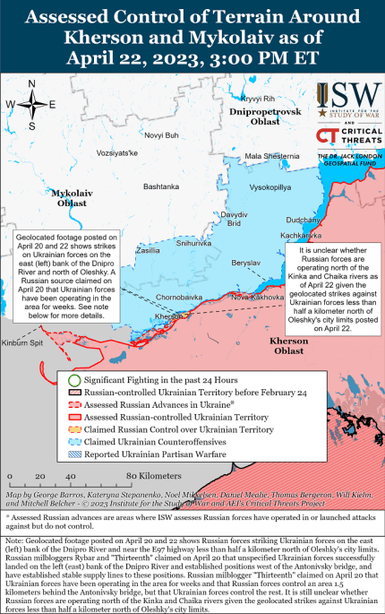 На карті бойових дій іншого "воєнкора" стверджувалося, що станом на 22 квітня російські війська не контролюють деякі острови в дельті річки Дніпро на південний захід від Херсона, що свідчить про можливе українське просування на цих островах.