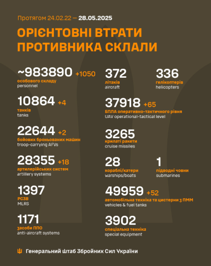 Загальні бойові втрати росіян з 24.02.22 по 28.05.25 орієнтовно склали: