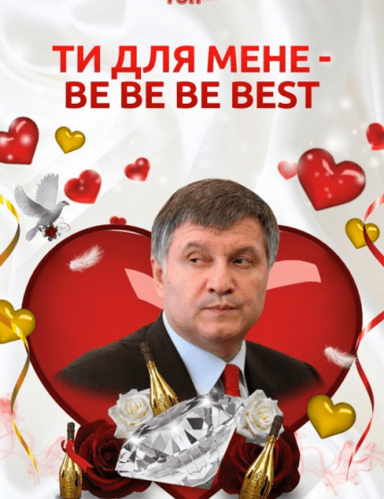 Так, свою другу половинку можна привітати валентинкою із зображенням президента України Петра Порошенка, мера Києва Віталія Кличка, Лідера Радикальної партії Олега Ляшка, секретаря РНБО Олександра Турчинова, екс-прем'єр-міністра Арсенія Яценюка, голови МВС Арсена Авакова й міністра закордонних справ Павла Клімкіна.