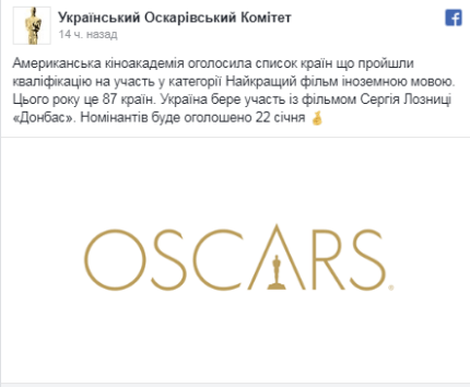 Фільм "Донбас" українського режисера Сергія Лозниці отримав право боротися за "Оскар". Кіноакадемія США включила картину про війну на Донбасі в список претендентів на престижну нагороду, повідомляє ONLINE.UA з посиланням на Український оскарівський комітет.