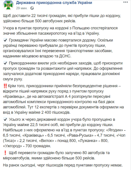 За минулу добу в Україну повернулися понад 37 тисяч українців з-за кордону у зв'язку з пандемією коронавіруса. Велика частина людей прибула до кордону пішки - для їх перевезення через кордон було здійснено близько 500 автобусних рейсів 80 автобусами. Через масове скупчення піших людей біля кордону утворилася значна черга. Всі українці, що повернулися додому, пройшли температурний срінінг і в установленому порядку оформили інформативні угоди про самоізоляцію. Подробиці масового повернення додому українців повідомила пресслужба ДПСУ, передає ONLINE.UA.