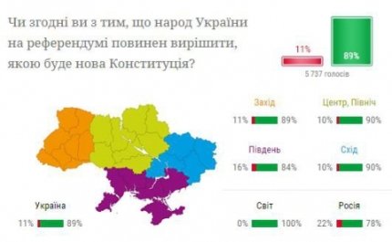Більшість громадян України (89%) підтримують ідею прем'єр-міністра і готові самі вирішувати, якою буде нова Конституція. Тільки 11% респондентів вважають, що зміни до Основного Закону держави повинні розглядати парламентарії.