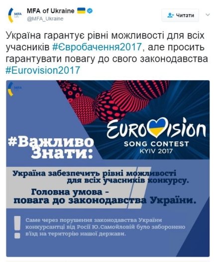 "Саме через порушення законодавства України конкурсантці від Росії Юлії Самойловій був заборонений в'їзд на територію нашої держави", - додали в МЗС України.