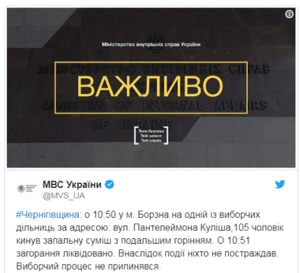 У Чернігівській області, у місті Борзна, на виборчій дільниці чоловік кинув запалювальну суміш, передає ONLINE.UA з посиланням на прес-службу Міністерства внутрішніх справ України.