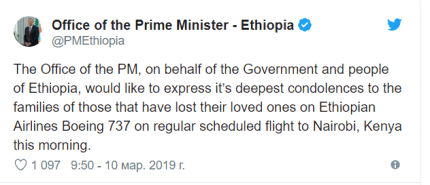 «Канцелярія прем'єр-міністра від імені уряду і народу Ефіопії хотіла б висловити найглибші співчуття сім'ям загиблих сьогодні вранці на борту регулярного рейсу Ethiopian Airlines в Найробі», - йдеться на офіційній сторінці політика в Twitter.