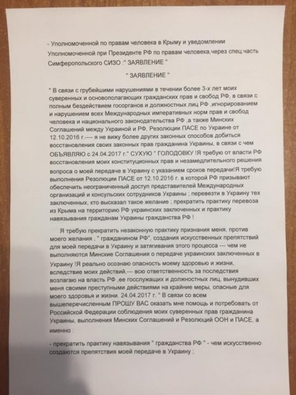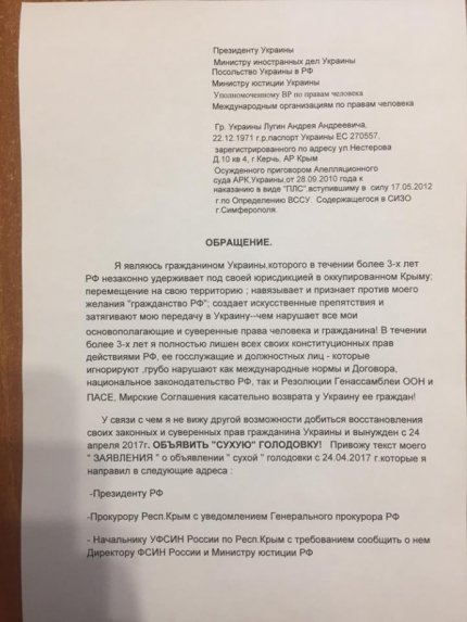 "Сьогодні на мою адресу надійшло звернення від громадянина України, засудженого Лугіна А. А., який утримується в Сімферопольському СІЗО. 26 квітня його планують етапувати на материк для відбування покарання. Від безвиході із завтрашнього дня він оголошує сухе голодування", - написав він.