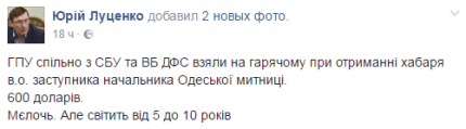 За словами генпрокурора Юрія Луценка, хабарнику загрожує позбавлення волі на строк до 10 років.